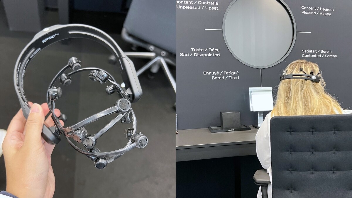 這次我就看到了一台香奈兒和法國頂尖大學-法蘭琪-康堤大學University of Franche-Comté合作的頭戴式機器,可以透過偵測腦波顯示出情緒變化,包括緊張、沮喪、難過、疲累、興奮、快樂、平靜等面向。參與研究的人戴上後,現在的情緒狀況就會顯示出來,而在擦了保養品或使用彩妝後,情緒也會跟著改變、產生波動,讓研究人員得以實際量化使用感。