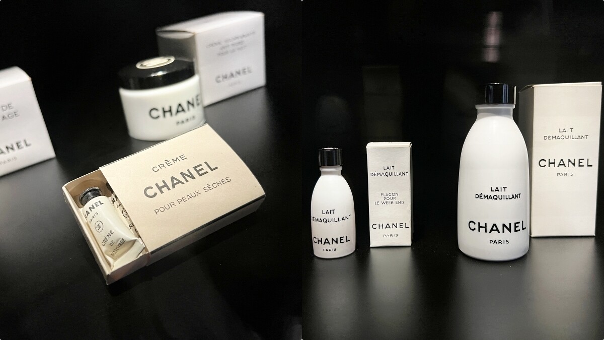 從當中更可以看到香奈兒女士推出了保濕乳、卸妝乳、身體保養油、防曬乳、助曬品,甚至還有旅行組。內部人員笑著解釋,當時香奈兒女士覺得需要什麼,就會請實驗室開發,旅行組就是方便讓她旅行時帶出門,因此產品特別實用。