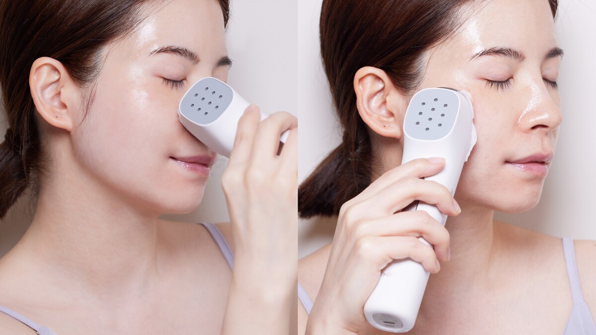 首先可以先用CLEAN模式,建議搭配清潔型化妝水+化妝棉使用,由下往上的方式滑動,有離子導出、溫感與振動的效果,搶先為肌膚去除毛孔等殘留的污垢,為後續導入保養做準備。