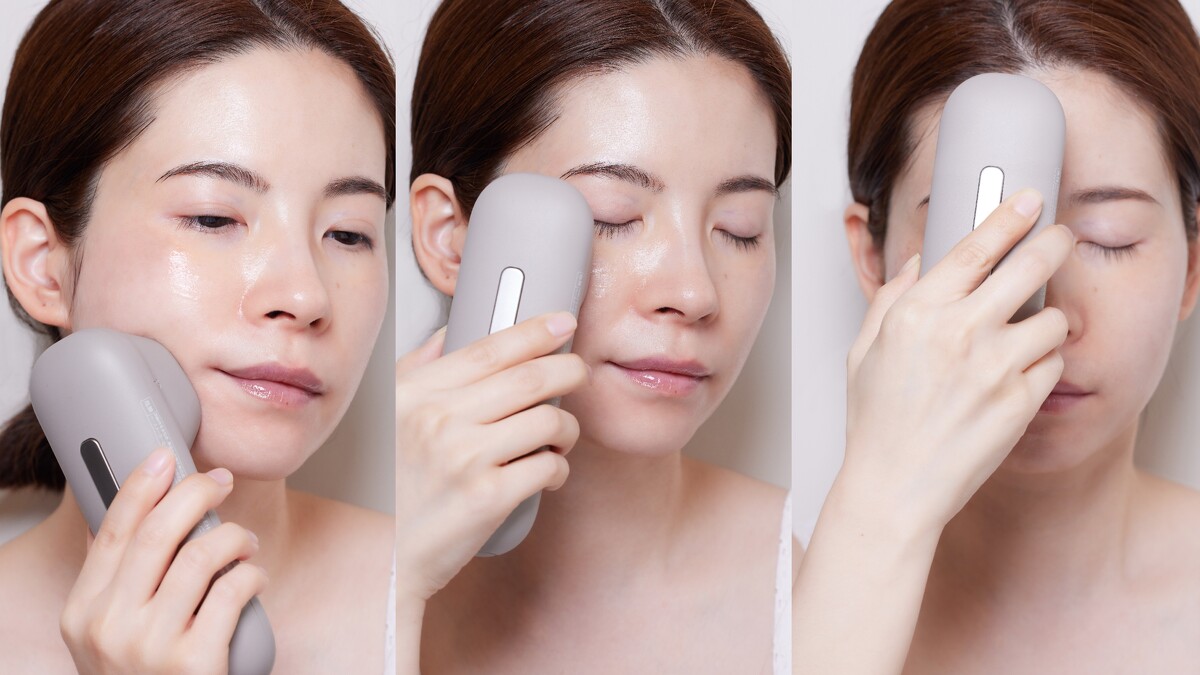 M編習慣搭配精華液或眼霜,順著肌膚由下往上滑動,離子導入、溫感,而獨家雙動態EMS波形,可以同步訓練表情肌,會感受微微電流但不會刺痛不舒服。