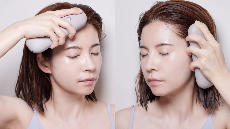 分別在額肌、顳肌、枕頭肌以Z字型移動,可以更容易接觸到頭部肌肉,接著每個定點用力按壓3秒,彷彿氣墊一樣的結構,一樣會感受到微電流感,非常舒服。