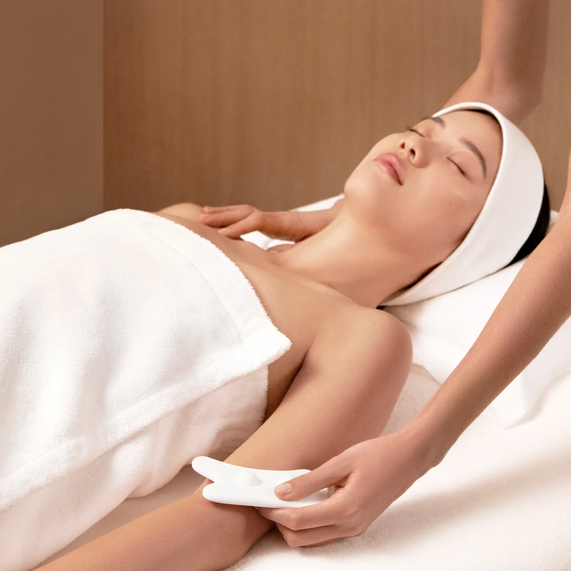 蘭蔻特別設計出全新「東方秘傳古法按摩肩頸」手法,搭配全新「絕對完美陶瓷刮痧板」,從現代人最容易累積疲勞壓力的肩頸開始,幫貴賓舒放淋巴、活絡身體!加上舒壓的耳穴頭療,針對耳朵、頭部重點穴道輕柔刮痧按摩,更能幫助你重拾活力、容光煥發,肌膚變美心情更好。