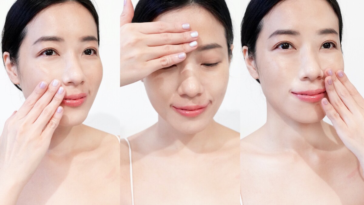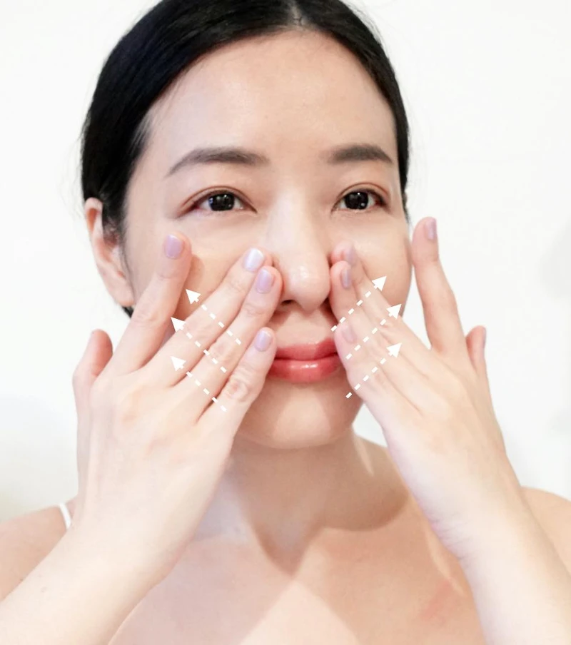 法令紋是最常見也是最令人困擾的表情紋路,法令紋一深就超級顯老,使用中指和無名指,沿法令紋由上至下,由裡向外輕拂推彈的方式,幫助撫平法令紋,還能拉提臉頰,讓澎潤Q彈蘋果肌重新回歸兩頰。