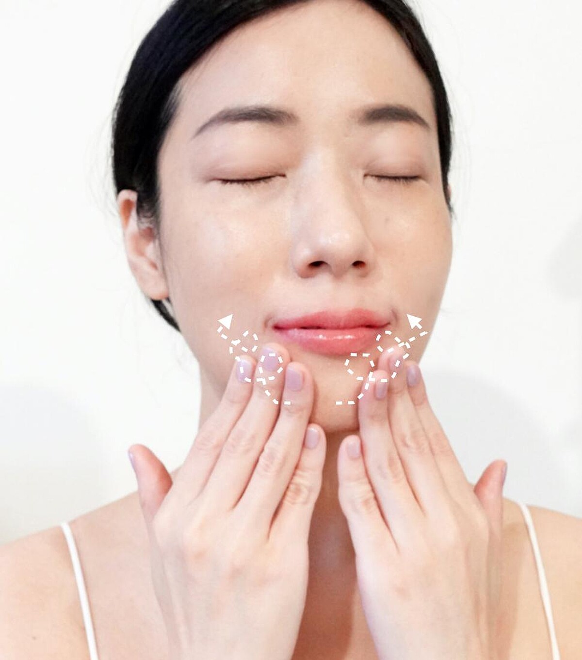 按摩是以手指腹的力量,從下巴往上沿唇周輪廓做畫圈動作,向上拉提下垂的嘴邊肉找回緊緻的V型下顎線,重複此動作也能讓下垂的嘴角回覆向上微笑菱角嘴。
