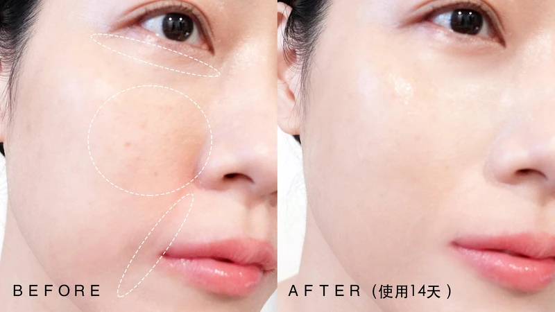 持續使用到14天後,一看對比圖,連M編自己都被細緻到閃出水光的膚觸給美哭,眼周小細紋和被M編列入少女殺手的法令紋,都像是被熨斗燙過一樣撫平無痕跡,兩頰最讓人困擾粗大毛孔通通有感縮小,膚質光用肉眼看就超平滑,原來已經下垂無彈性的臉頰一按壓實在有夠膨彈,說是比少女時期的膚況還要好真的完全一點不誇張。