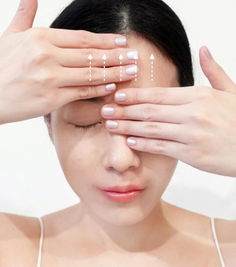 抬頭紋是很常被在保養步驟被忽略的部位,以兩隻手的中指和無名指由下往髮際線方向按摩,如圖所示,向上拉提撫平橫向紋路。