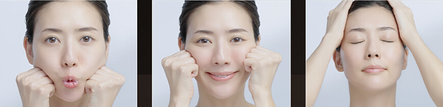- 01. 一澎:噘起嘴巴做出「U」的嘴型,按壓肌膚並向上拉提維持三秒。沿著下巴到耳下、嘴角到耳朵,每個動作慢慢移動,依序向上拉提三處。