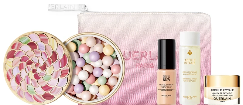 幻彩流星蜜粉球#冷白皙(正品)、24K純金光透精華粉底5ml、皇家蜂王乳蜜露 15ml、皇家蜂王乳蜂蜜修護白霜7ml、嬌蘭化妝包。《販售櫃點:台中三越/高雄統一時代/信義三越 A8/台南三越西門/新竹巨城》
