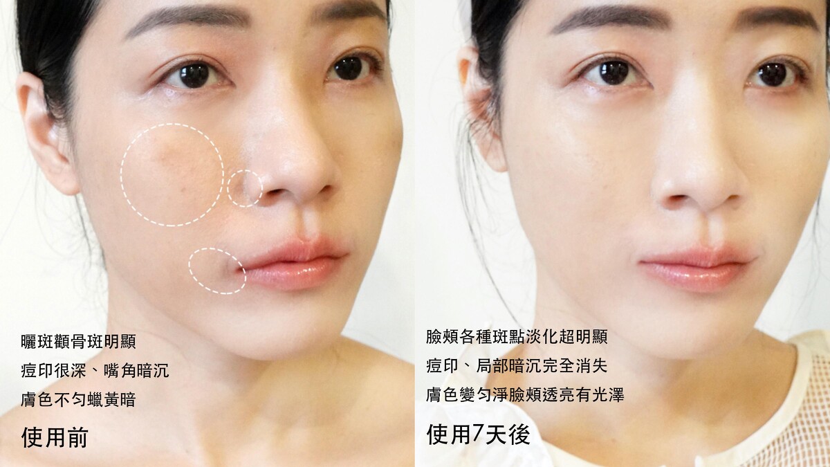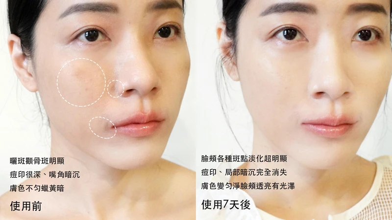 “全臉膚色勻淨透亮,膚質細緻、痘印斑點通通神隱” (使用14天後)