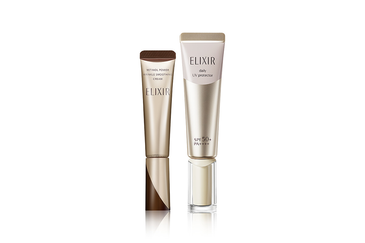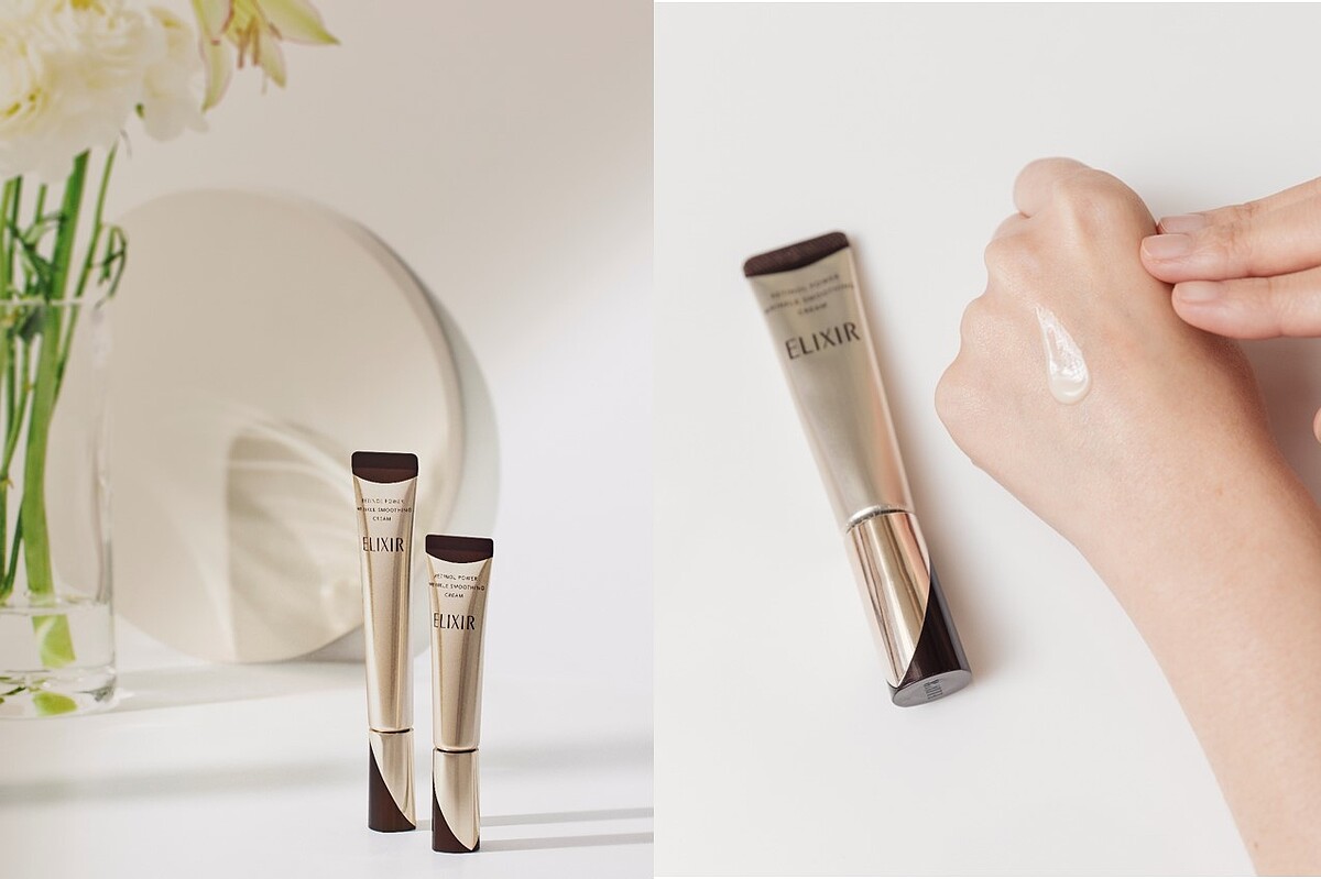 用了ELIXIR怡麗絲爾「膠原緊V澎潤霜」幫肌膚拉提又澎彈之後,再用「A醇小金管」加強撫紋抗皺,瞬間完成「垮臉CPR」,平滑無瑕、緊緻彈潤的年輕肌就能輕鬆達標!