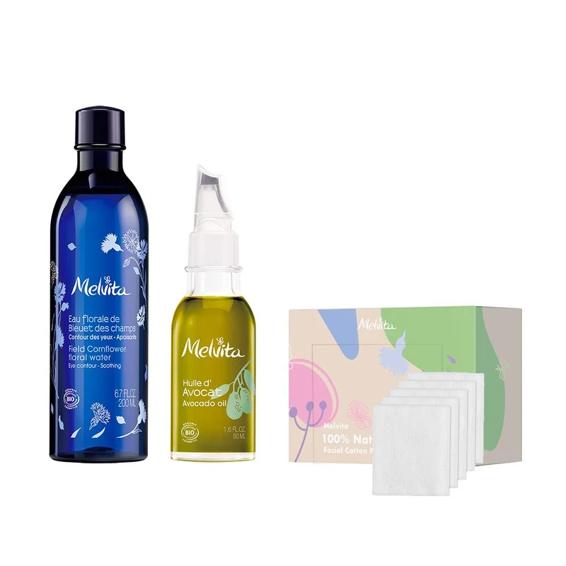 酪梨油 50ML+矢車菊花粹 200ML+Melvita濕敷專用棉,NT.1,780 (價值NT.2,280/ 78折)