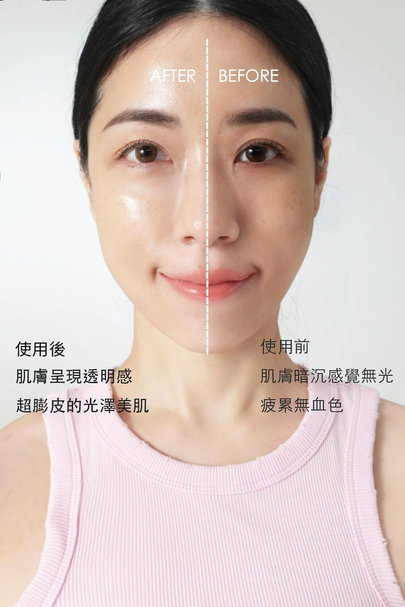水潤肌柔光透亮飾底防曬凝露 玫瑰粉上臉實測:超real玫瑰粉上臉的半臉對照比較,完全不誇張,只要抹一層就像直接開了美肌濾鏡。左右兩邊的真的差~很~多!潤色提亮、修飾瑕疵,原本肌膚蒼白暗沉疲累無血色,立即變成透明感無瑕美肌,用完真的沒有人能抗拒這種肌膚原地直接變身透明系水光仙女肌的大進化!無限回購是不是真的剛好而已(笑)!