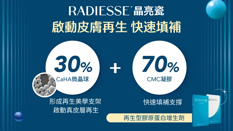 大家所熟知的晶亮瓷被國際期刊證實是再生型膠原蛋白增生劑。陳雅惠醫師分享:「晶亮瓷是由 30% CaHA 微晶球和 70% CMC凝膠組成。CMC凝膠可以快速填充凹陷,而大小均勻、光滑圓潤的CaHA 微晶球會形成再生美學支架ARS,活化纖維母細胞,再生真皮層中細胞外基質的5關鍵,以恢復年輕時期皮膚的功能與質地。」