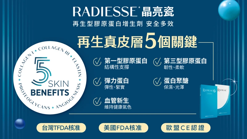 晶亮瓷(Radiesse瑞得喜植入劑) 通過美國FDA、歐盟CE、台灣TFDA三大認證,臨床上使用已達20多年,熱銷全球60多國,更擁有超過250份國際期刊研究。同時請選擇原廠認證的診所及醫師,在追求美力的同時,安全性從嚴把關。