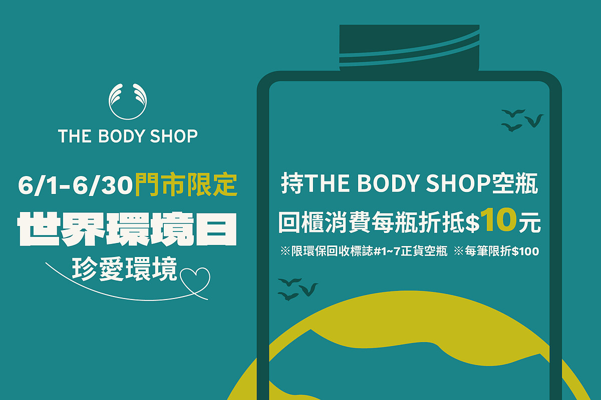 衷於保護地球,以支持社區公平交易、反動物實驗為品牌精神的THE BODY SHOP在世界環境日也推出門市限定6/1-6/30持THE BODY SHOP正貨空瓶至門市回收,每個空瓶折抵10元,最高折抵 100元限抵扣正價商品,現場加入會員並追蹤官方社群帳號即可「領取喜瑪拉雅竹炭更新淨化面膜5ML乙份」,首次消費滿NT1,200再贈「茶樹淨膚調理水60ML乙瓶」,從肌膚修護清爽去油光到身體潤澤保養,全部都能一次買齊,夏天最強的優惠就在THE BODY SHOP!