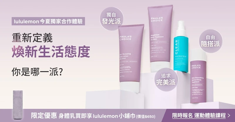 1.官網獨家優惠!:於7/4 起在寶拉珍選官網購買2%水楊酸身體乳或10%果酸身體乳單支,即贈lululemon The Towel 小鋪巾 (顏色:Lilac Ether,價值NT$650) *限定寶拉之友。每個帳號限定贈送一次,數量有限送完即止*