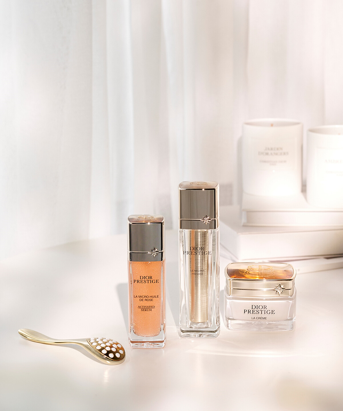 日夜的玫瑰保養儀式,賈靜雯會先使用《DIOR精萃再生玫瑰微導精露》,密集且快速地替肌膚補充微營養素,改善疲憊膚況與環境傷害、回歸健康好狀態,輕盈水潤的精華質地,一抹快速吸收滲透,散發療癒優雅玫瑰香氣;第二步驟使用《DIOR精萃再生玫瑰源萃》,傾注「岡維拉初蕾玫瑰」極致鮮萃的99種活性分子,能針對已形成的皺紋鬆弛,從根源逆轉老化、倒轉肌齡;最後使用《DIOR精萃再生玫瑰賦活乳霜》封存頂級岡維拉玫瑰活膚能量,持續緊緻、彈潤肌膚,再現平滑柔嫩、水潤透亮的膚況,讓她即便拍戲忙碌熬夜也有粉嫩發光的好氣色。搭配《DIOR微導珍珠按摩壓勺》:鑲嵌「21 顆陶瓷微導珍珠」的玫瑰花瓣設計,能完美貼合臉部曲線,細微按摩每寸肌膚,提升保養滲透率,有感加倍緊緻輪廓!