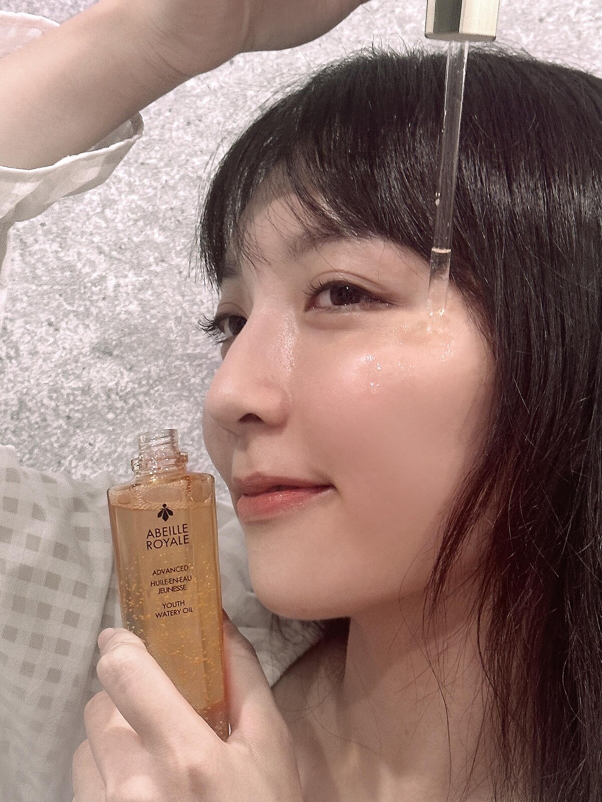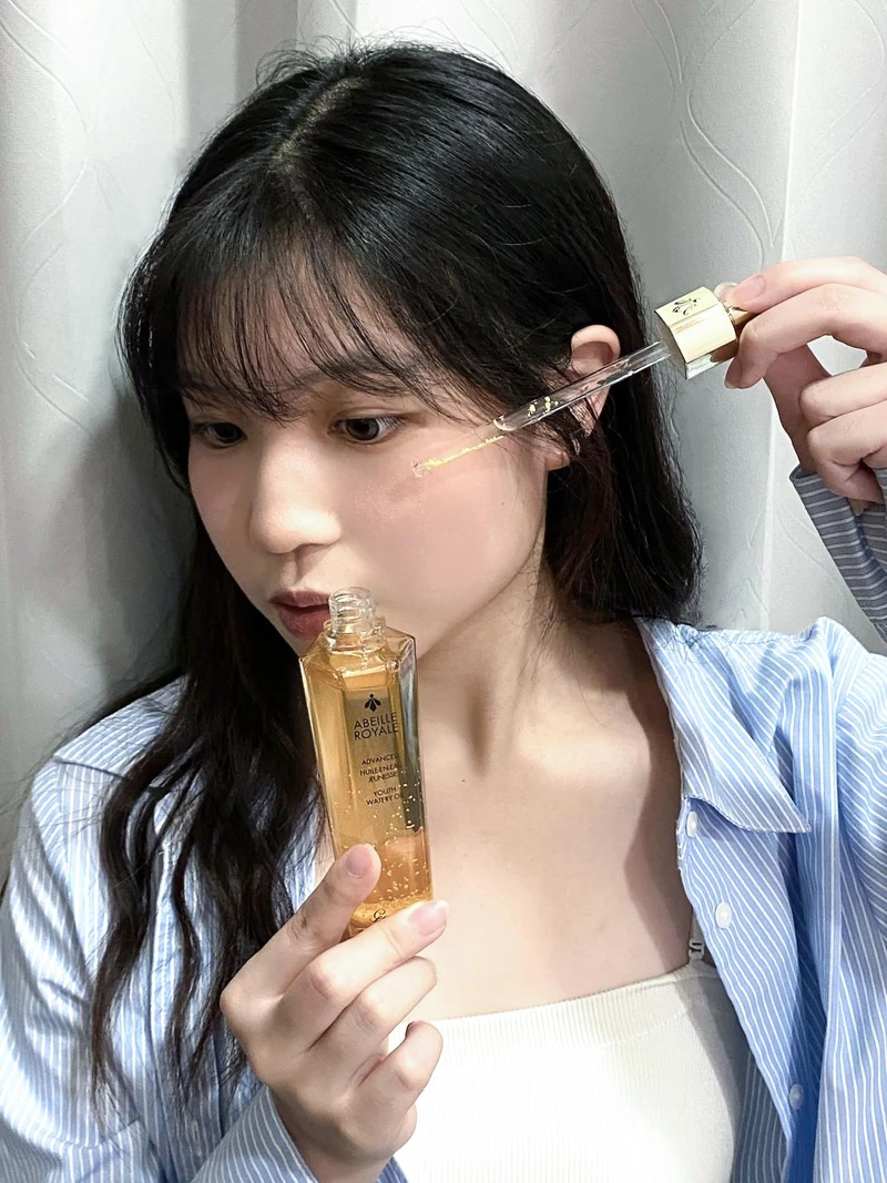 先用具有改善乾燥細紋、暗沉蠟黃、顯老倦容的小金瓶擦於全臉,接著將濃縮25倍蜂王乳成分以嬌蘭雙層微脂囊科技讓「皇家蜂王乳蜜露」#神蜜水搭配化妝棉濕敷全臉,超強聯手餵養肌膚史上最高濃度的蜂蜜成分,三分鐘肌膚平滑、細緻、水嫩、亮到爆!