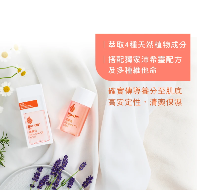 想淡化身體肌膚紋路問題的人,「Bio-Oil百洛專業護膚油」也能早晚集中塗擦於紋路與周邊肌膚,帶來密集撫紋與修護效果,使肌膚在這水潤舒服的滋潤中一天比一天更年輕無痕,與紋路溫柔地說Bye bye!