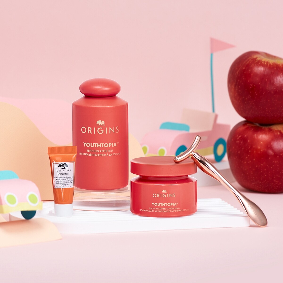 內容:蘋果精露100ml正貨、蘋果澎澎霜50m正貨、元氣眼霜5ml、蘋果肌拉提棒。