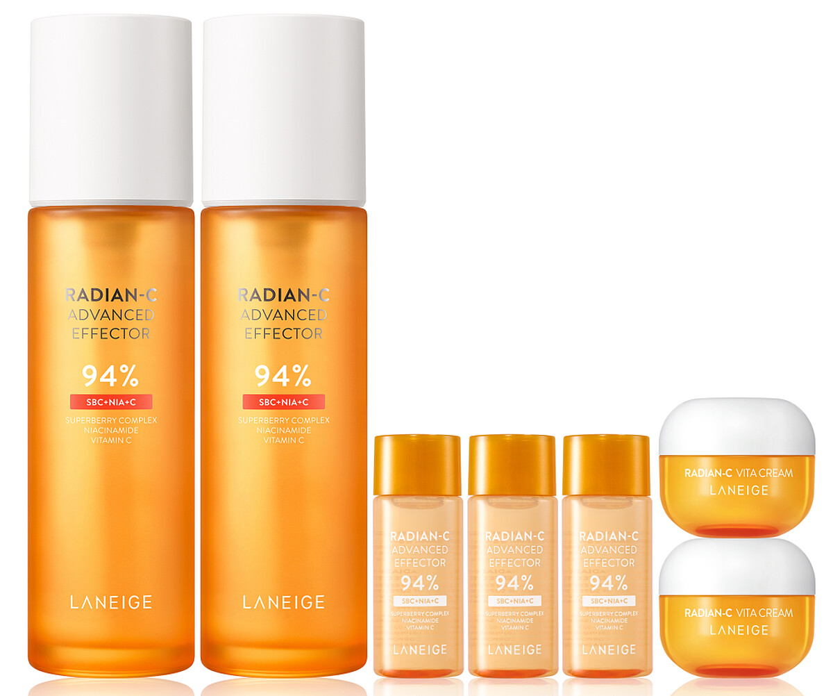 內容:維他命C淨亮精華50ml+ A醇淨膚超修護安瓶50ml,贈送雙茶保濕修護精華組。