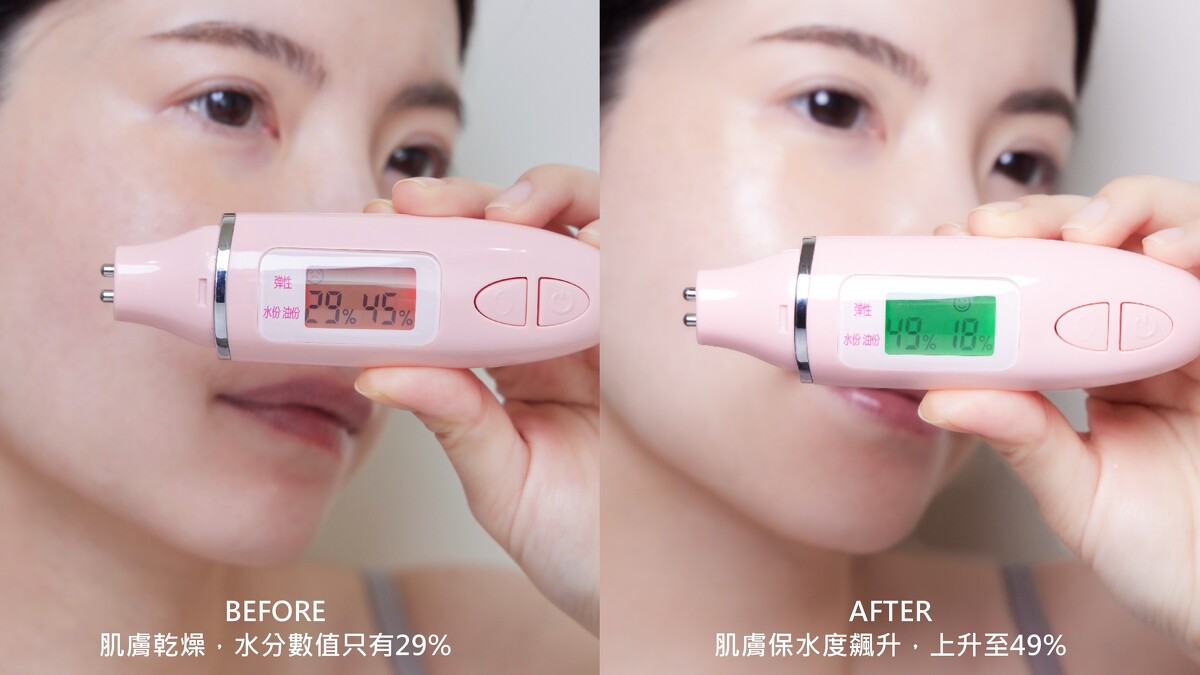 而且不要以為清爽版就不夠保濕,添加親膚性高的角鯊烷、酪梨油、甘油,滋養有感卻不易致粉刺,肌膚超水超亮彈。用水分儀測試效果看得見,數值直線上升20%不誇張,從29%-49%、保水效果就是這麼優秀~