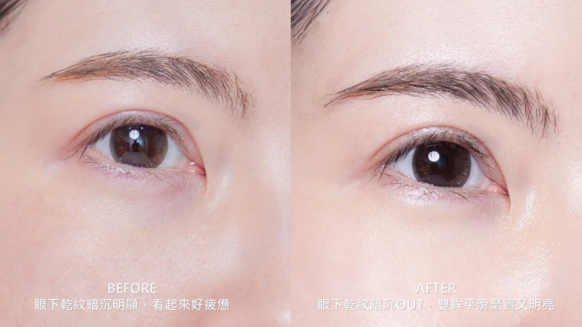 BA對比照超明顯,眼下乾紋暗沉通通OUT,明亮度也提升,看起來不只緊實又平滑,因為肌膚感覺緊緻了、因此視覺上讓雙眼有放大的效果呢~