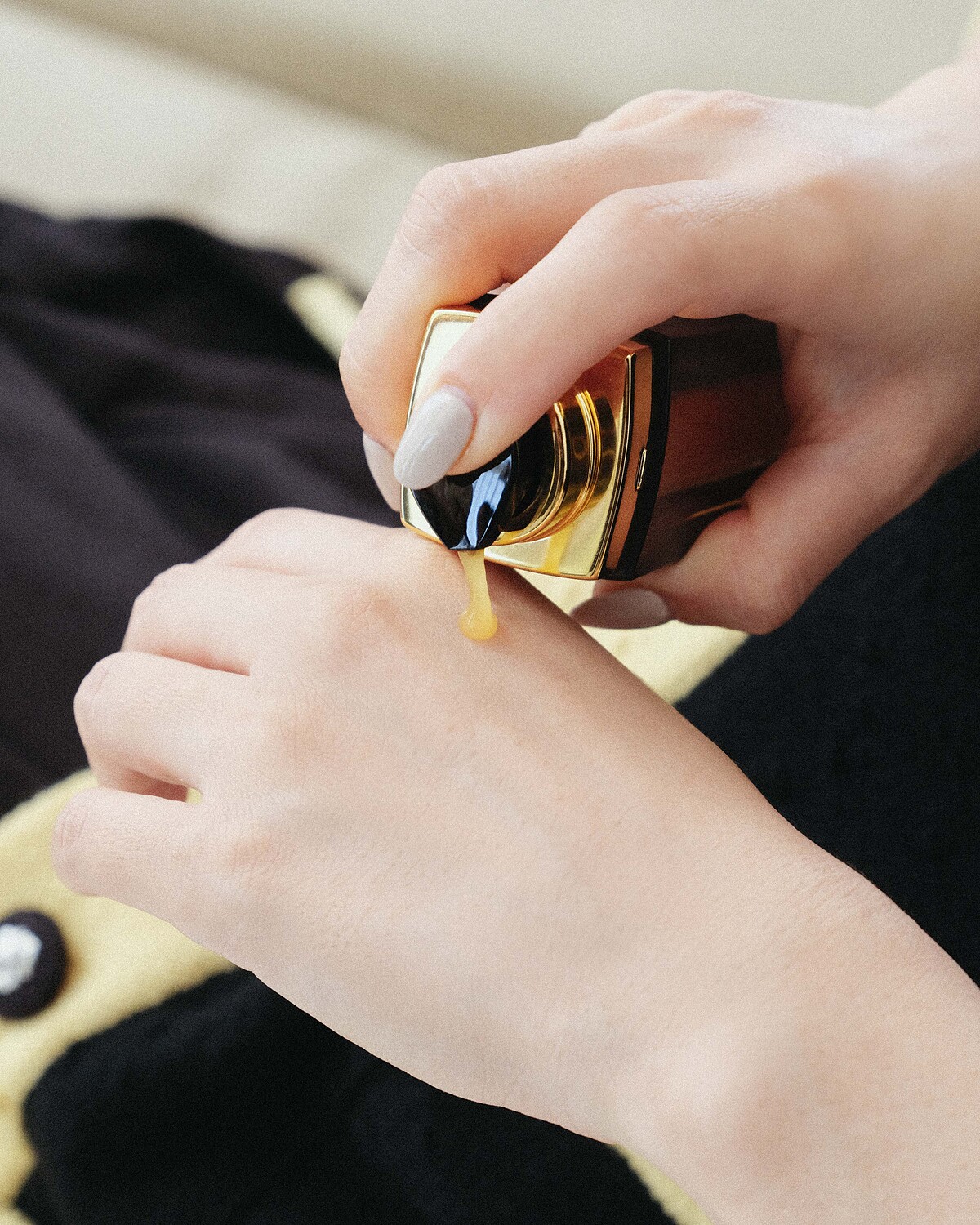 天生膚質容易感覺乾燥的趙岱新,對香奈兒奢華極萃系列每一款產品都有難以割捨的喜愛,但如果只能擁有一瓶,她的選擇是:「我真的非常愛香奈兒奢華極萃肽金賦活油!它是我沒時間好好保養時,單用一瓶就讓膚況如我所願的選擇。晚上搭配按摩令肌膚更細緻柔嫩,白天妝前用使妝容更服貼漂亮,是保濕力與養膚效果都無可挑剔的頂級保養油。」