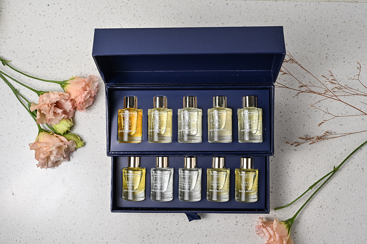 內容:晚間舒緩沐浴油 9ml、晚間舒緩噴霧 10ml、晚間舒緩滾珠香氛 10ml、明煥精油沐浴露 50ml、明煥晨曉沐浴油 9ml、舒肌沐浴油 9ml、舒緩凝膠 40ml、舒肌精油沐浴露 50ml、怡神沐浴油 9ml、怡神滾珠香氛 10ml