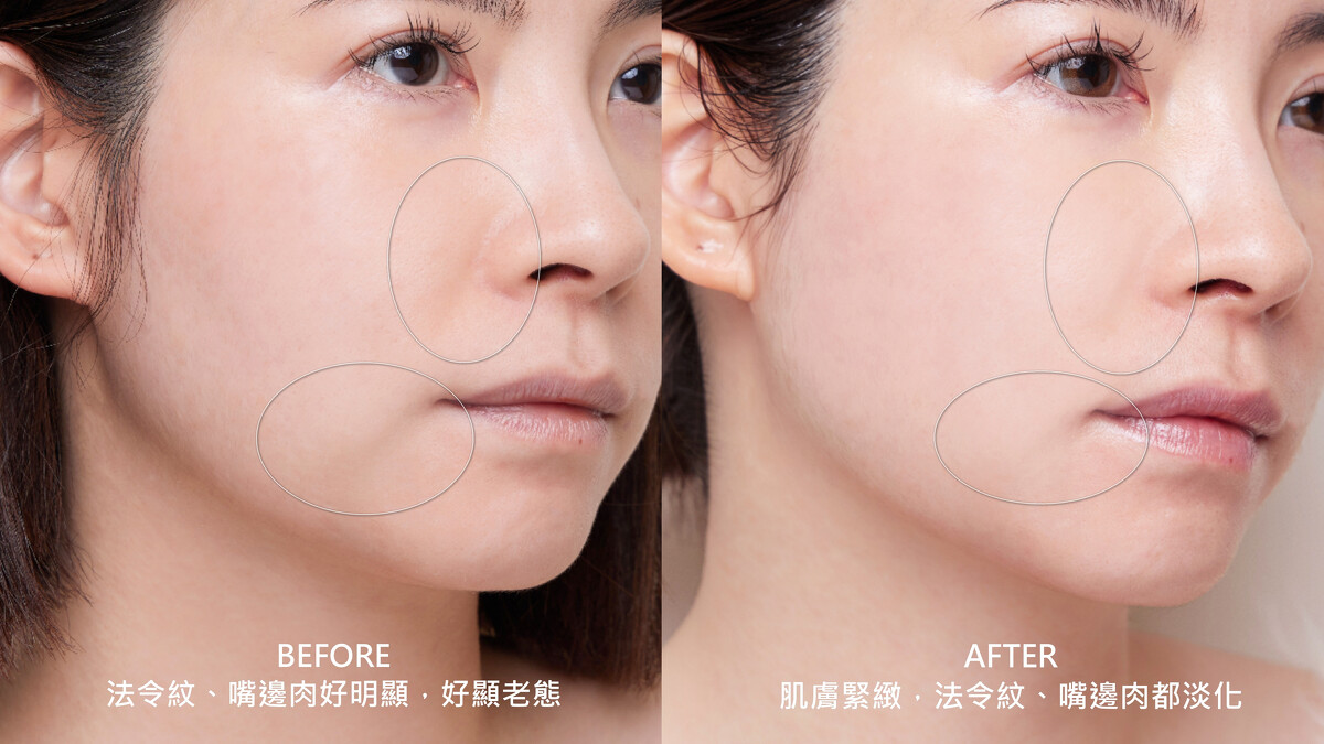 原本M編的法令紋、嘴邊肉好明顯,看起來很顯老@@現在肌膚變緊緻了,連帶讓紋路也淡化不明顯,摸起來又彈又滑嫩,瞬間年輕3歲以上~