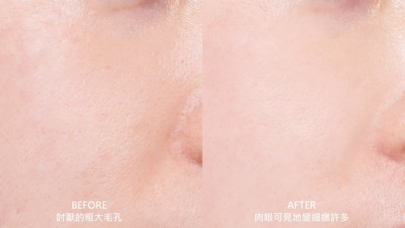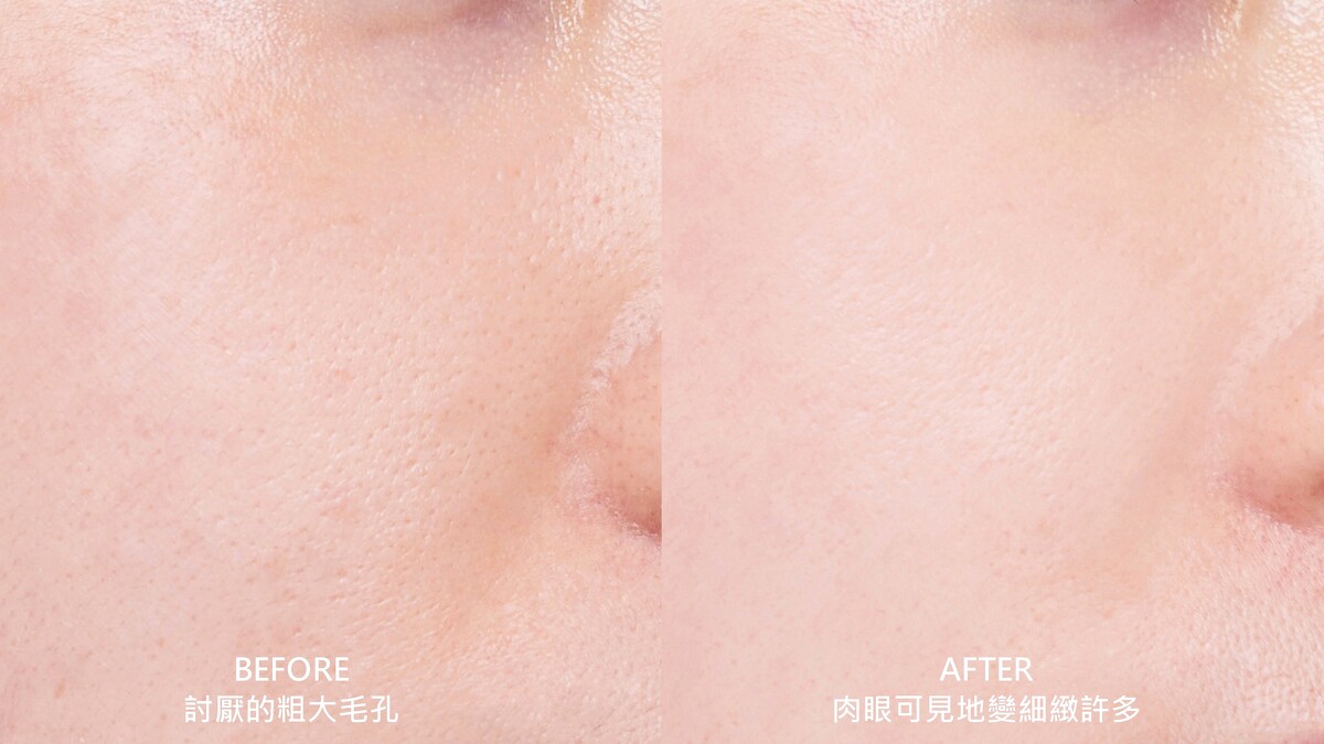 最驚艷的是毛孔的部分,原本討厭的粗大毛孔、真的肉眼可見地變細緻許多,現在不只上妝更平滑服貼,也不用再費心遮蓋填補毛孔,有夠開心!