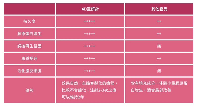 A:「4D童妍針」是透過聚左旋乳酸微粒刺激膠原蛋白增生,去年世界醫美抗老醫學會更發布了4D童妍針最新數據顯示,4D童妍針可調控肌膚再生基因,重建肌膚的微環境讓膚質提升,4D童妍針從源頭全面均衡改善肌膚老化問題,與傳統填充劑在臉上填填補補大不相同,4D童妍針能讓肌膚變得更透亮、有光澤,並消除皺紋、拉提重塑輪廓,也因顆粒均勻除了能刺激膠原蛋白增生,透過經驗豐富具有美感的專業醫師的巧手,更能展現個人特質並且不用擔心注射過多填充材質產生饅化問題。完全不必擔心會不自然。