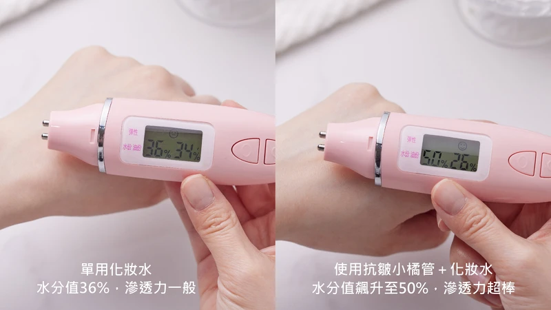 透過滲透力小實驗可以發現,將使用前導小橘瓶+化妝水 V.S. 單用化妝水來對比,都有使用化妝水的狀態下,水分值還能再飆升14%,前導小橘瓶的滲透效果有夠厲害!!!