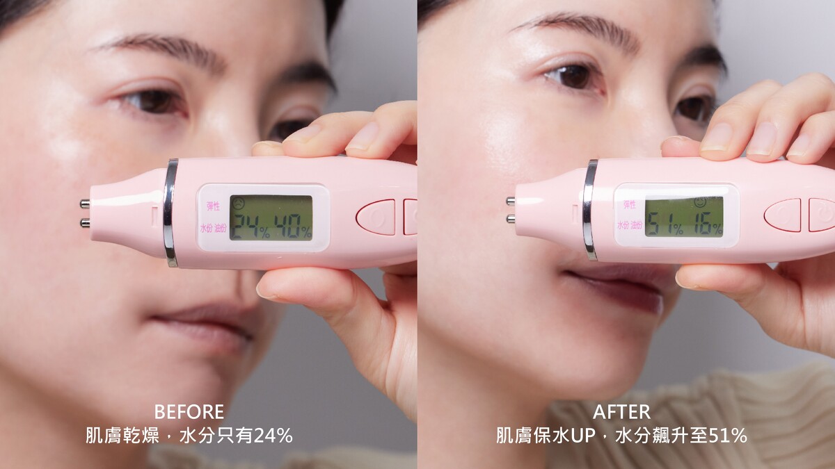 保濕效果也超威!透過水分儀實測就知道,使用前肌膚好乾又粗糙,使用後不誇張,水分立刻飆升2倍UP,從乾妹變嫩妹、必須推爆!