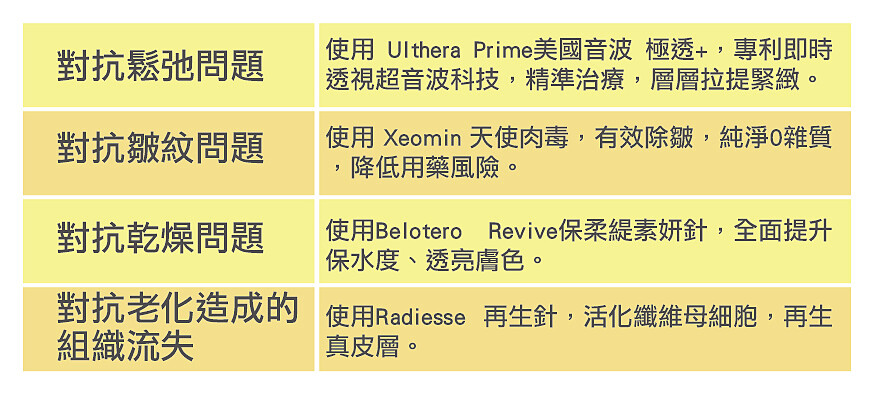 需要全面改善皺紋、鬆弛、毛孔、斑點、乾燥等老化問題,最適合以複合式的療程來調理改善,莫氏醫學美容的4大療程都能依個人情況來搭配。而其中以已被國際期刊定位為再生型膠原蛋白增生劑的Radiesse 再生針,藉由30% CaHa微晶球與70%CMC凝膠,提供再生美學支架,活化纖維母細胞,再生真皮層5種關鍵成分*,由內而外再生真美肌。