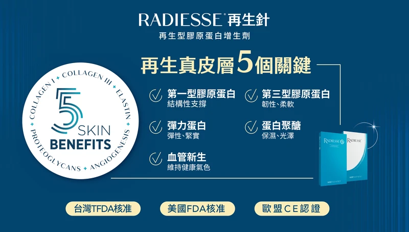 有別於傳統的填補或傳統膠原蛋白增生劑專注於刺激膠原蛋白的生成,再生針可同時兼顧皮膚原理和消費者期待,如何美得更健康、更自然、更安全!再生針是由30% CaHA 微晶球和 70% CMC凝膠組成,CMC凝膠擁有優異的黏彈性,可於療程當下快速填補支撐,以達肉眼可見的改善效果;而CaHA 微晶球忠於皮膚原理,會形成臨時性再生美學支架ARS,從源頭活化纖維母細胞,重建膠原支撐網,全方位再生真皮層健康5關鍵,讓皮膚自主恢復彈性與緊緻: