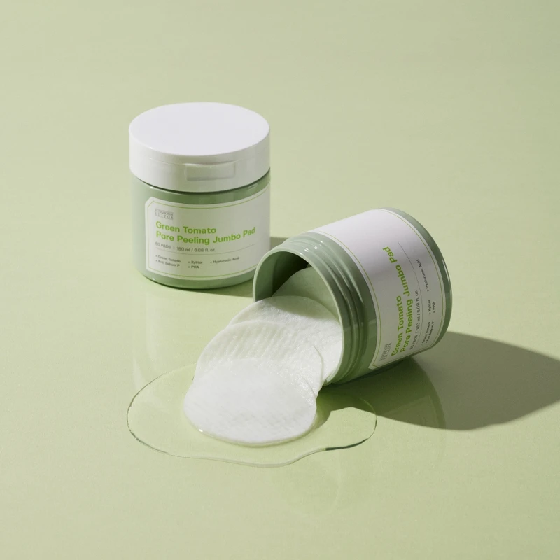 綠番茄去角質棉片顧名思義以綠番茄萃取為核心,針對緊緻毛孔與油脂分泌問題一次解決,搭配PHA果酸與毛孔潔淨複合物,幫助清除老廢角質並改善膚質粗糙;搭配五重玻尿酸成份同時補水舒緩。
