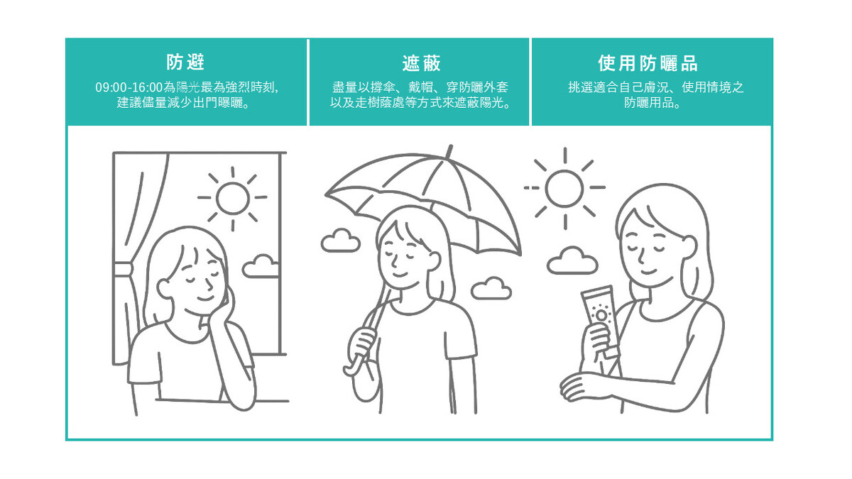 「防曬不應該只是yes or no的是非題,而是可以依照當天紫外線強度來因應,調整適當的防護措施。」邱品齊醫師表示,現在氣象預報都有紫外線指數可以參考,出門前不妨先確認一下。「防避、遮蔽以及使用防曬品」是防曬重點。尤其台灣最熱的夏天,早上九點到下午四點左右,建議儘量減少出門曝曬陽光。走在路上也可以盡量以撐傘、戴帽、穿防曬外套以及走樹蔭處等方式來遮蔽。