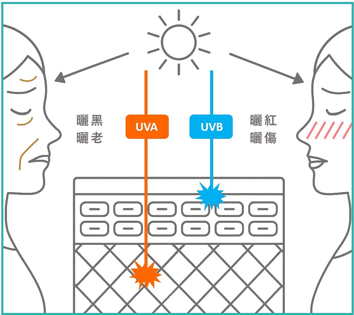 陽光中主要會影響皮膚的紫外線分成UVA以及UVB,邱品齊醫師說明:UVA會造成皮膚曬黑、曬老,而UVB則會造成曬紅、曬傷,所以不管你是想要美白或抗老,最基本的必做保養就是防曬!