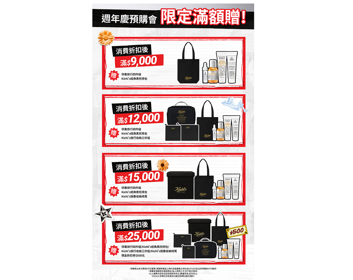 ●百貨預購會不可錯過的當然有滿額贈:你搭捷運時一定看過有人背Kiehl’s包吧! 怎麼背怎麼潮!今年全新回歸最潮週邊經典托特包、旅行收納三件組、摺疊收納椅凳買檻滿額都有不同選擇,再搭上超值豪華旅行組一起送給你!
