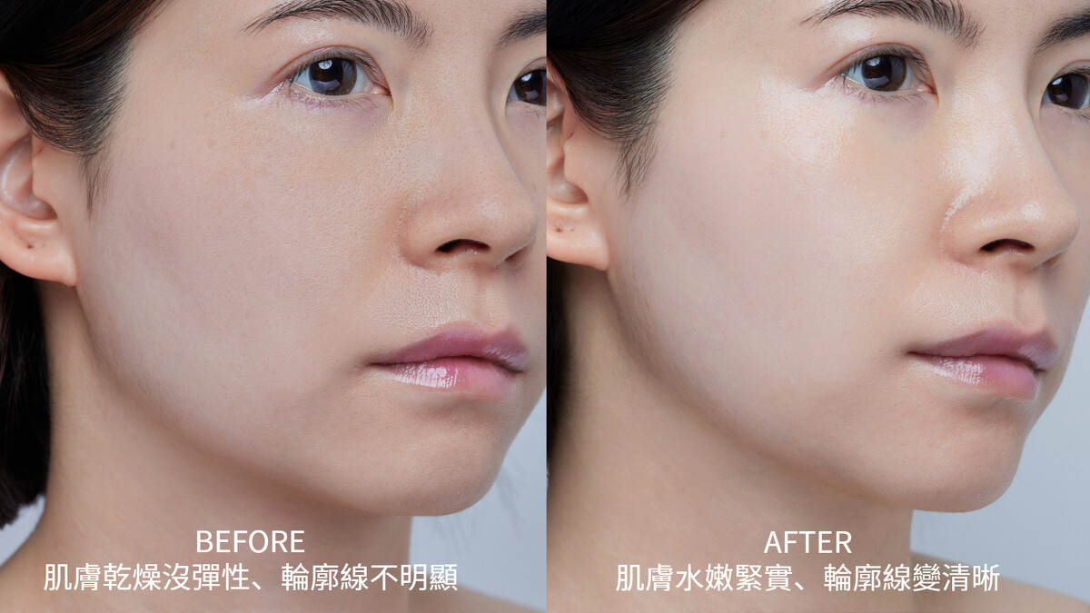 持續使用,會發現肌膚變緊實且豐盈,摸起來有彈性飽滿,視覺上更顯年輕~最驚喜的是、照鏡子時輪廓變得更立體、下顎線變更清晰,讓M編連嘴角都不自覺上揚(開心到偷笑)!!