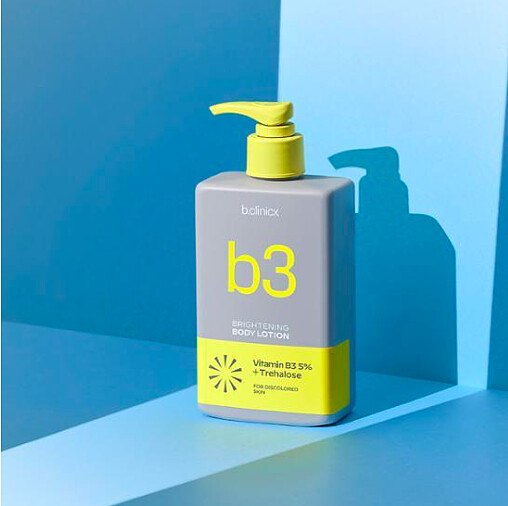 b.clinicx是韓國身體保養專門品牌,主打身體保養不僅限於保濕,更需要給予身體肌膚應有的保養,因此推出這款含有5%菸鹼醯胺的美白身體乳(Brightening Body Lotion/비클리닉스 나이아신아마이드 5% 브라이트 턴온 바디로션),主打改善膚色不均,特別是幫助淡化手肘、膝蓋及腋下的色素沈澱。