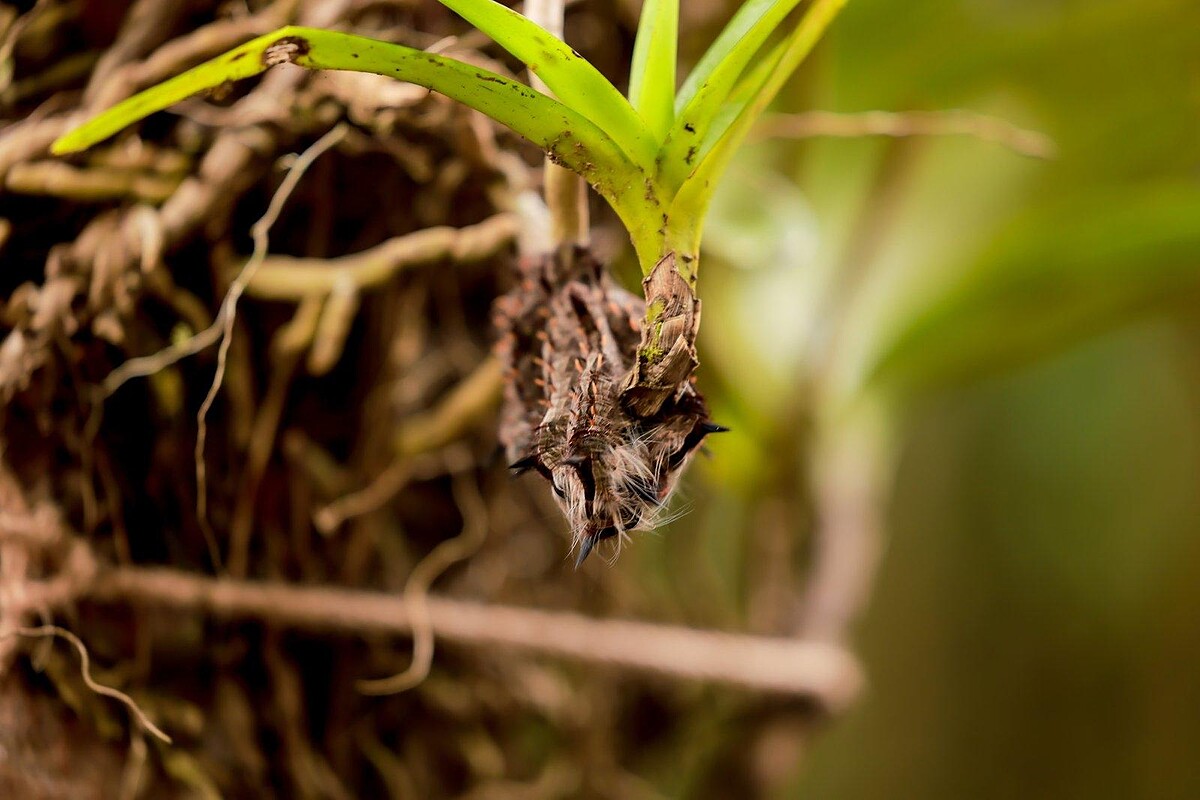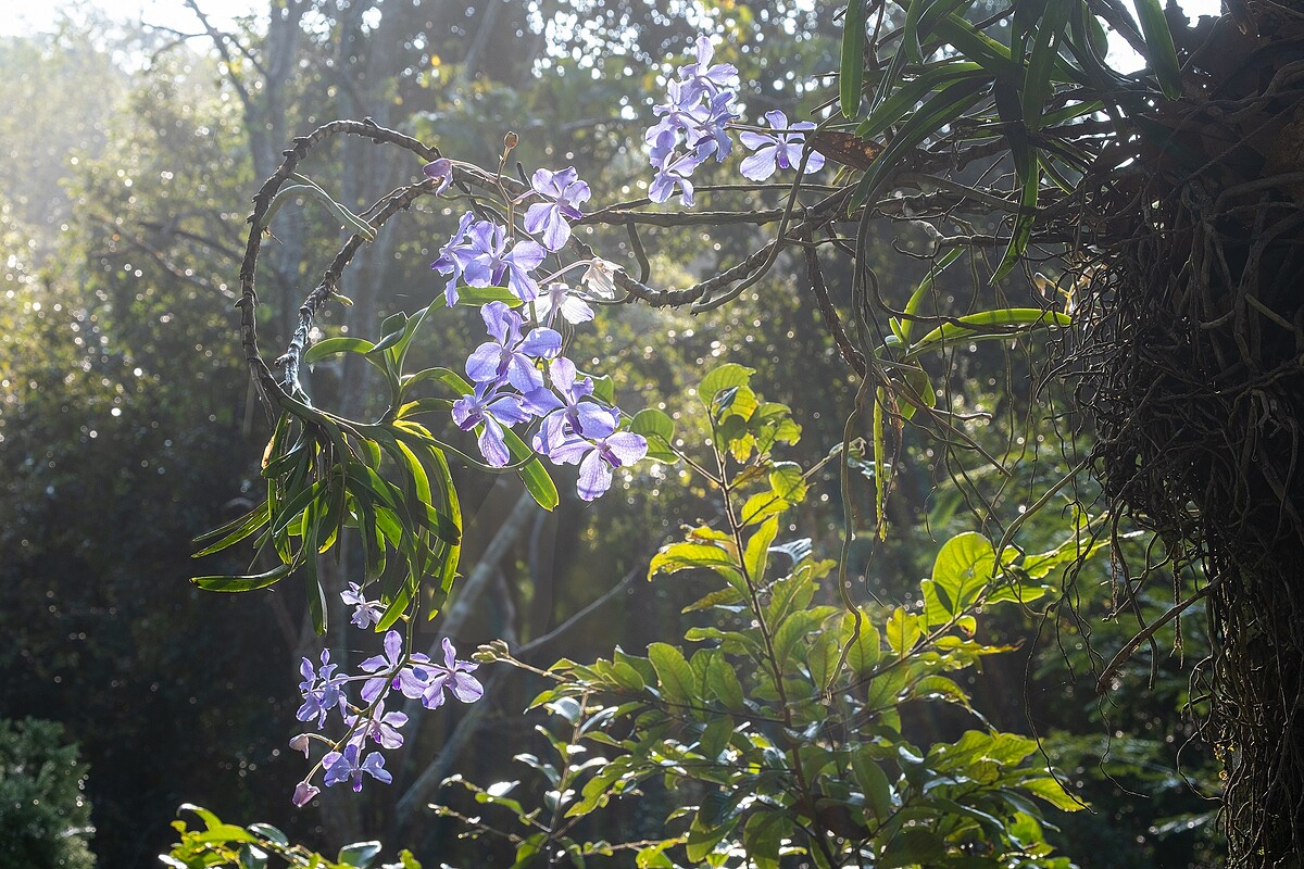 雨林裡,大藍萬代蘭是典型的附生植物,並不依靠土壤,而是將根部緊緊附著於樹皮。雨季時,它能在短短幾分鐘內吸滿水分並加以儲存;旱季來臨時,根部的「覆被薄膜」宛如天然海綿,緊緊鎖住水分,供應花苞與果實。