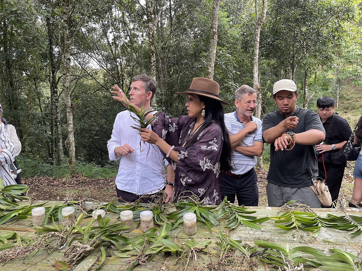 新品發表另一個強調的焦點是「永續」。在天籽園區,我親眼看到雨林再造的具體模樣:從底土到樹梢,研究人員與當地居民攜手,種下新的藤本植物、果樹與芳香草本,吸引昆蟲回歸,也讓萬代蘭有了自然的授粉者。這樣的循環,保護了瀕危植物,也讓原住民布朗族獲得收入,能在家鄉維持生活。