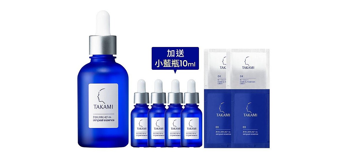 內含TAKAMI 角質道小藍瓶30ml*1+TAKAMI CE精華 30ml*1,送 TAKAMI 角質道小藍瓶10ml*1+TAKAMI 角質道小藍瓶1.2ml*5
