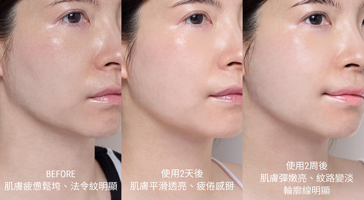 卸妝後搭配按摩使用,果然一擦上臉就快速吸收,M編馬上就有感皮膚看起來更滑嫩,隔天早上起床照鏡子,疲倦感直接掰,看起來氣色精神都滿分。使用2週後,整體膚況超水嫩、還多了彈嫩感,連討厭的法令紋都變淡了,最誇張的是久違的輪廓線都現身say hi,連同事都問M編是不是去做醫美,誰能不愛!短時間內讓彈潤提升、臉部線條側臉變化有夠明顯,難怪它有"超越醫美級保養"的稱號,而且最棒的是—它每天都能用,無痛、無需修復期,還不用花大錢,立刻手刀買起來!
