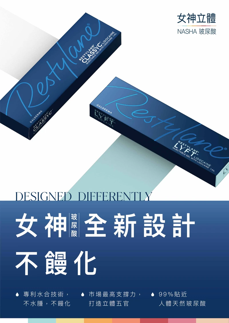 為打造宛如天生的個人化理想輪廓,「女神玻尿酸」依據不同層次及部位需求打造了多樣劑型的玻尿酸。其中「女神立體 NASHA™ 玻尿酸」,擁有獨家專利水合技術,吸水性遠比它牌低6倍,能避免玻尿酸吸水過度膨脹,因而大幅減少水腫、術後腫脹的饅化感。術後即呈現最終效果!
