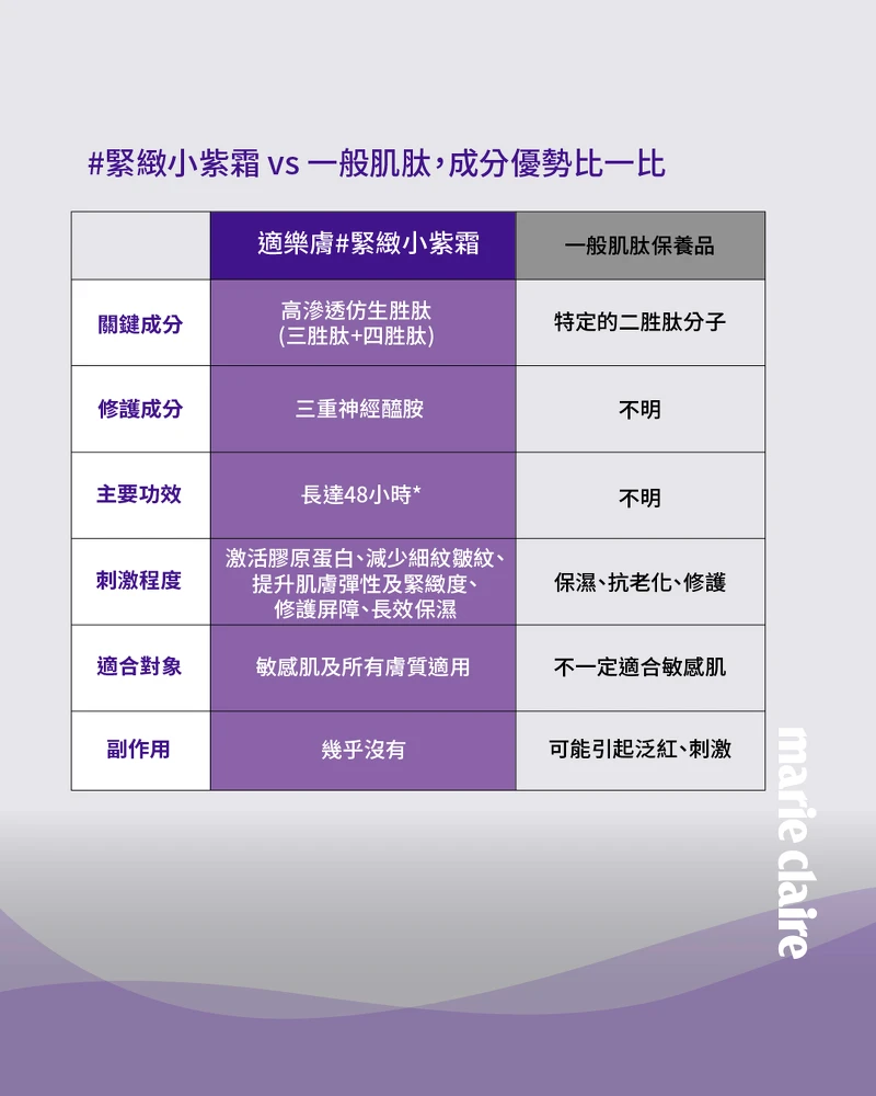 無論是日常的抗老維穩期,或是醫美療程後的脆弱期、居家刷酸後容易出現乾燥緊繃與脫屑的時候,#緊緻小紫霜都能提供即時而溫和的修護保濕,無添加香精、酒精、paraben類防腐劑,各種情境都百搭。由內而外撐起緊緻澎彈,使肌膚每天早晚在絲滑好吸收、不留黏膩感的呵護下,改善細紋與鬆弛,重回Q彈年輕狀態!