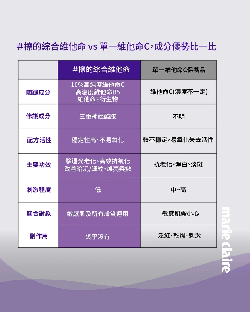 不同於市面上單一維他命C產品,#擦的綜合維他命 採用10%高純度維他命C、維他命B5、維他命E的複合維他命配方,三種維他命能相互協同作用;維他命C幫助對抗光老化、淡化暗沉細紋並促進膠原蛋白生成,維他命B5舒緩肌膚敏弱不適、提升保水度,維他命E則進一步幫助抵禦紫外線帶來的肌膚傷害。再搭配適樂膚經典修護成分「三重神經醯胺」,在有感煥亮的同時,仍能維持肌膚屏障穩定與水嫩狀態,是一款連敏弱肌也能安心使用的「發光神器」。