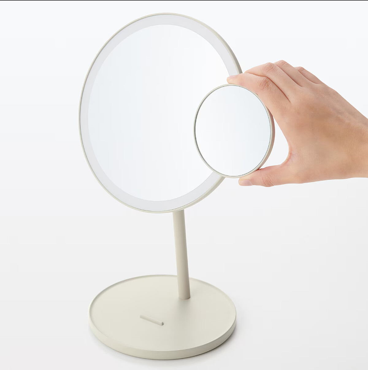 採用接近自然光的LED燈源,提供三段式亮度調整,並附有磁吸式5倍放大鏡,方便日常化妝使用。